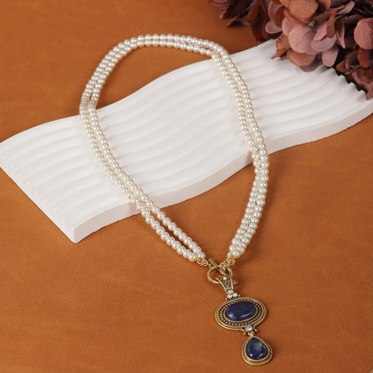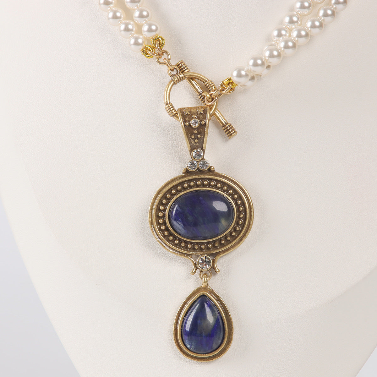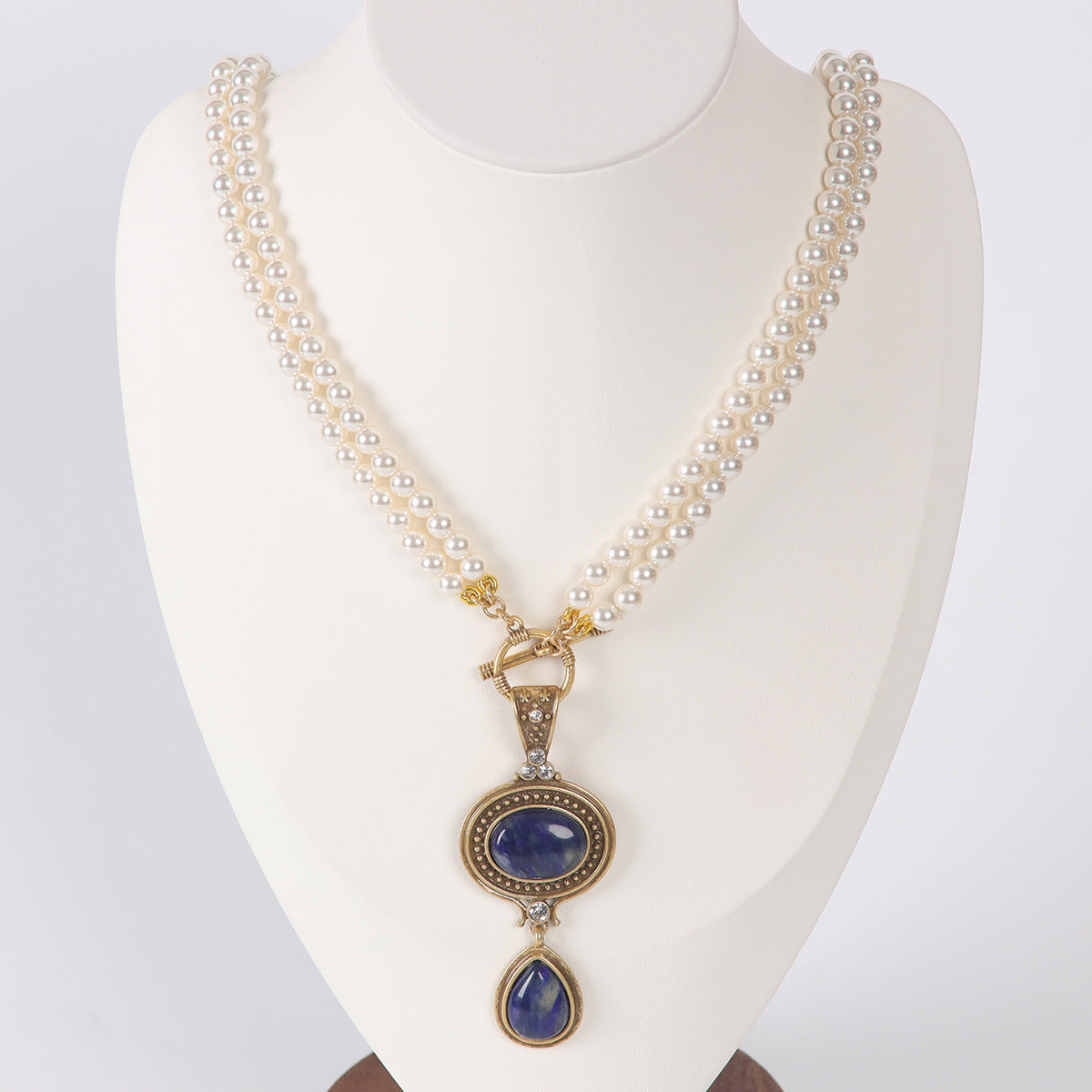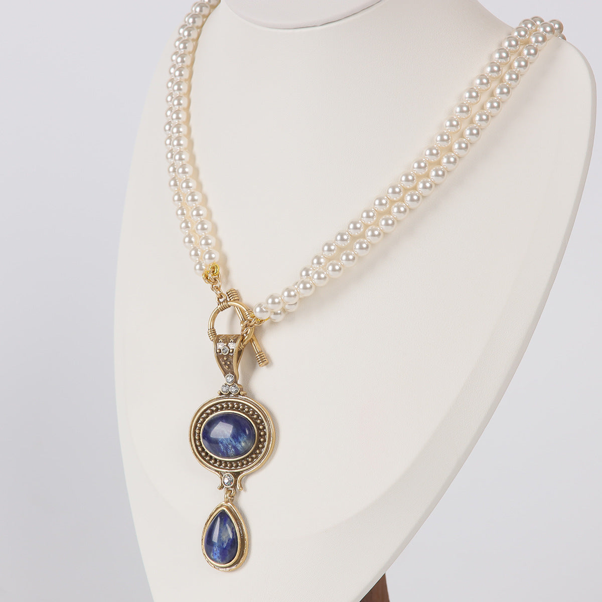 Drawing inspiration from centuries-old European and American artistry, this necklace is expertly crafted to evoke the romance of yesteryear fused with modern sophistication. Artisans meticulously hand-inlay natural blue stones and pearls, transforming each necklace into a work of wearable art reminiscent of historical luxury.