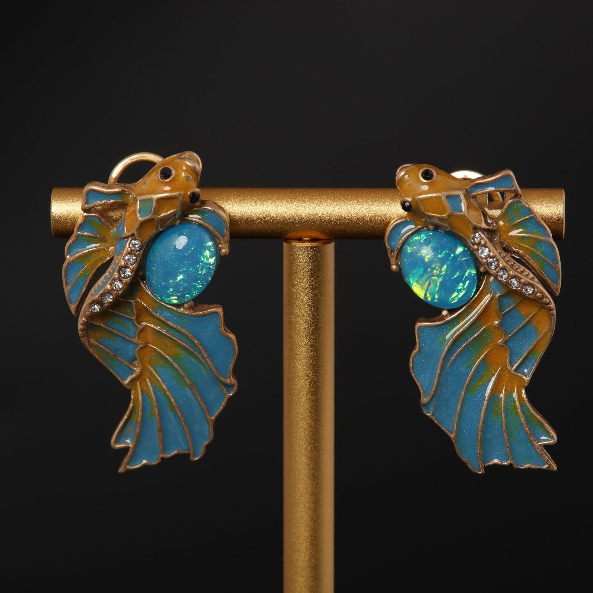 Experience true exclusivity with this striking medieval vintage high sense European and American style temperament niche copper plated enamel drop glaze fish earrings brooch set?aavailable only in limited quantities for discerning jewelry lovers.