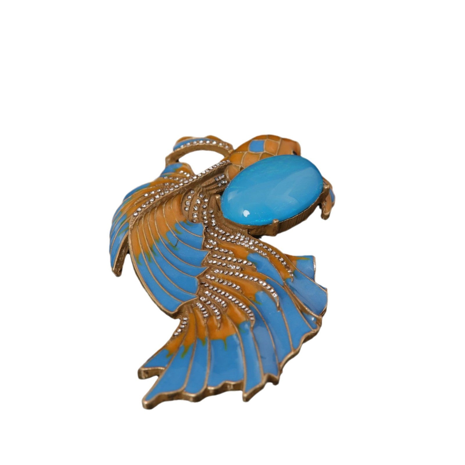 - Coordinating fish-shaped earrings and brooch offer versatile styling options